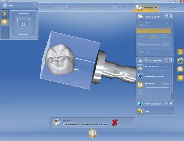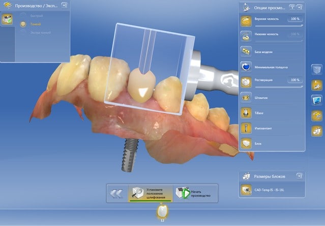 Созданная на компьютере реставрация на фрезеровальном аппарате вытачивается из керамического блока
